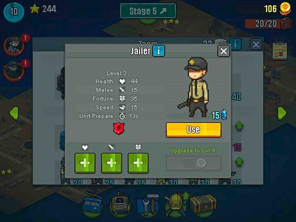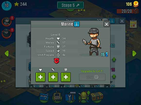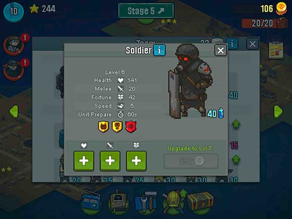 每一个兵种配合了相应的装备物资,玩家作为指挥大哥,还要为自己的小弟装配好攻击、防御、血量的加成装备,这些装备会通过战斗获得,也有商店可以购买。