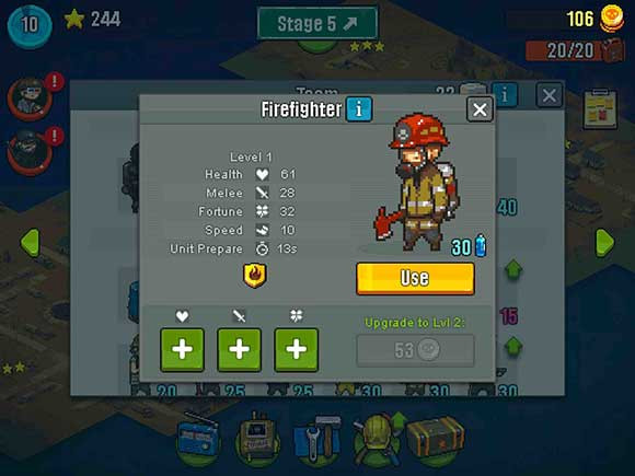 兵种,是游戏设计的一个重要元素,也是对抗尸潮的核心关键。已收集解锁的兵种,在战斗中会以牌面形式列出,通过时间累积获得的能量,可以放出不同的兵。兵种之间也有不同角色:灵敏机动的输出、皮厚能抗的肉、拿枪射击的远程、迅速的突袭等等,辅以油桶、医药箱、发电机等战中物资辅助战斗,才能与敌方多类的僵尸对抗。