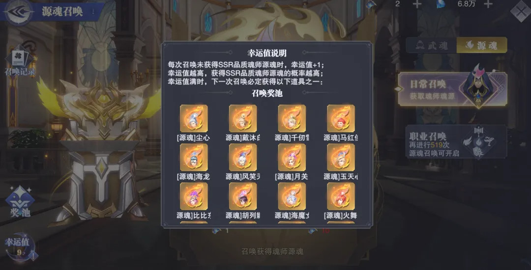 ①想要提升不同魂师的源魂力,需要通过在柳二龙处新增的“源魂召唤”来随机抽取,抽取逻辑和过去的武魂觉醒非常类似,而抽到SSR级别魂师“源魂”的概率为3.67%,SP级别魂师的魂源就目前来看将以限时卡池形式放出。