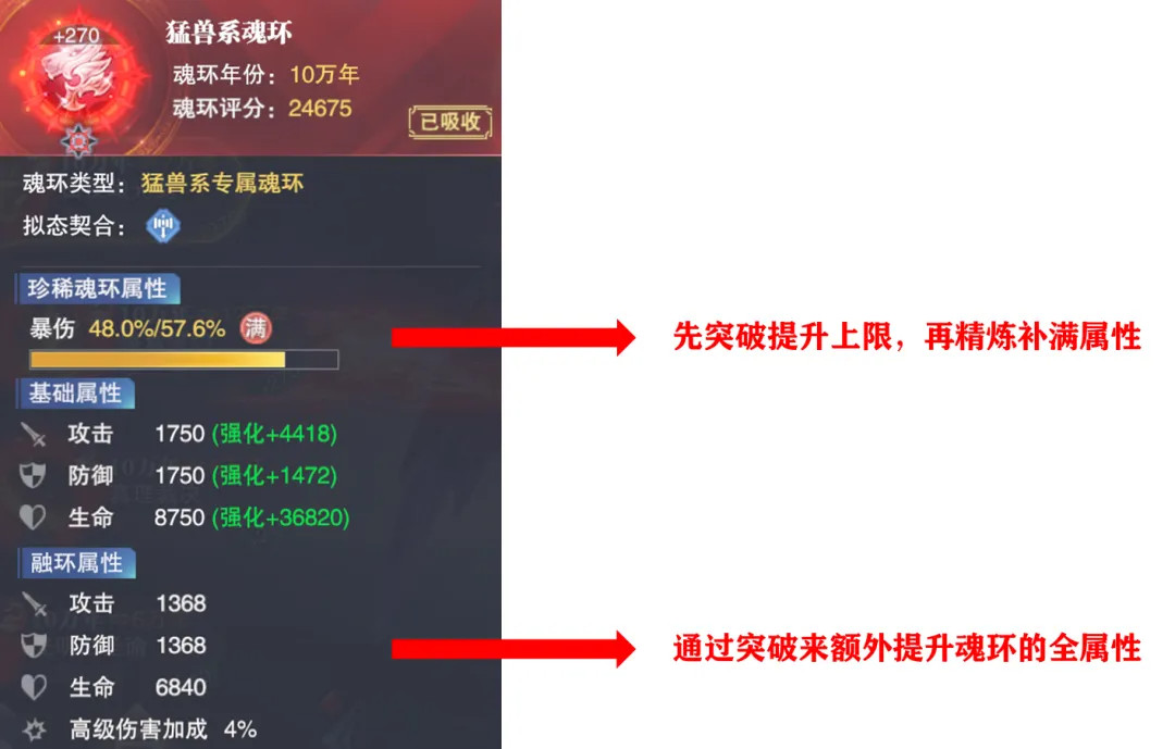 耗费同样属性的特定年限魂环对魂环原属性进行上限提升,例如原来的魂环是10万年48%的暴伤,则在融环精炼后,其可以提升到80%多甚至是更高的暴伤上限......这个也可以参考下图