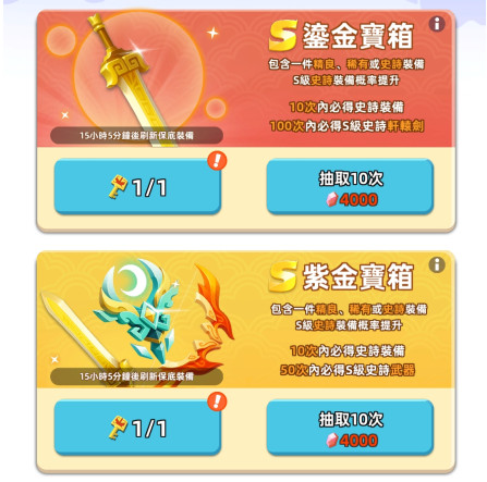 5、珍宝阁最底下的白银宝箱和黄金宝箱会赠送两次免费的机会,有一定的几率可以抽到S级装备。