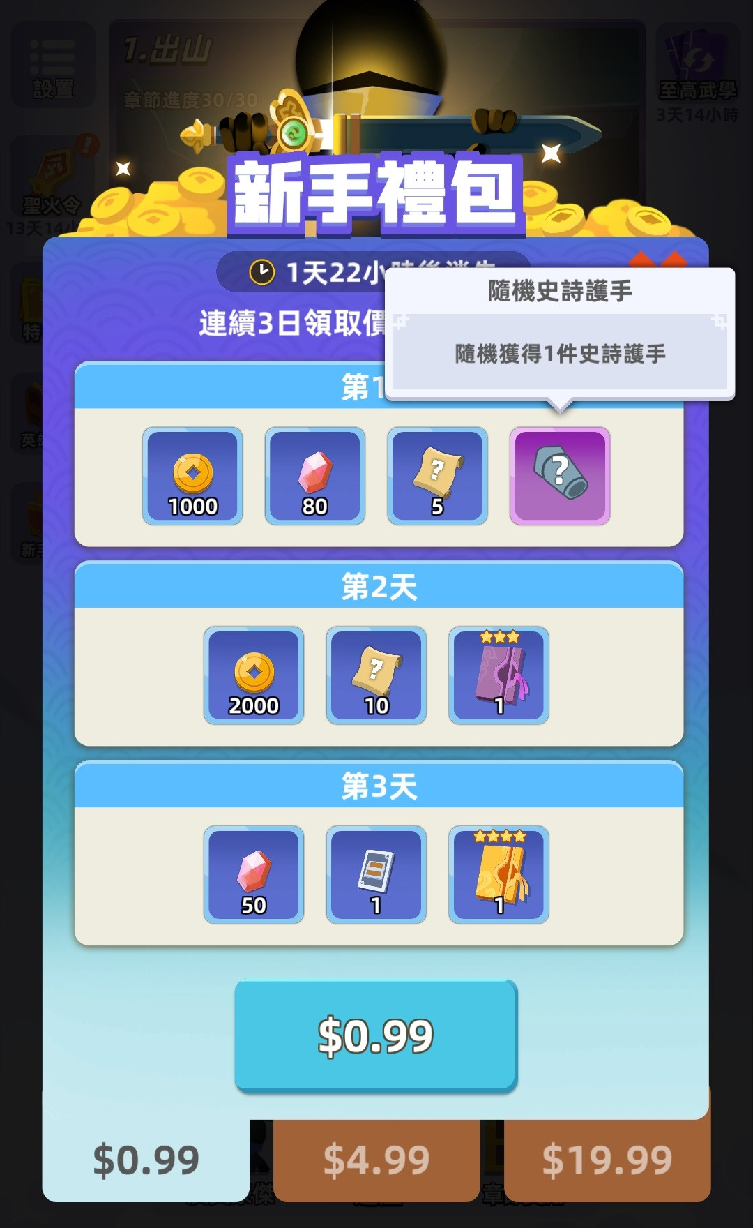 7、新人可以解锁新手礼包,第一天可以领取一个随机的史诗护手。