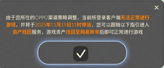 步骤二:登录待资产找回的OPPO渠道账号,出现游戏内提示弹窗后,点击【√】前往进行资产找回。