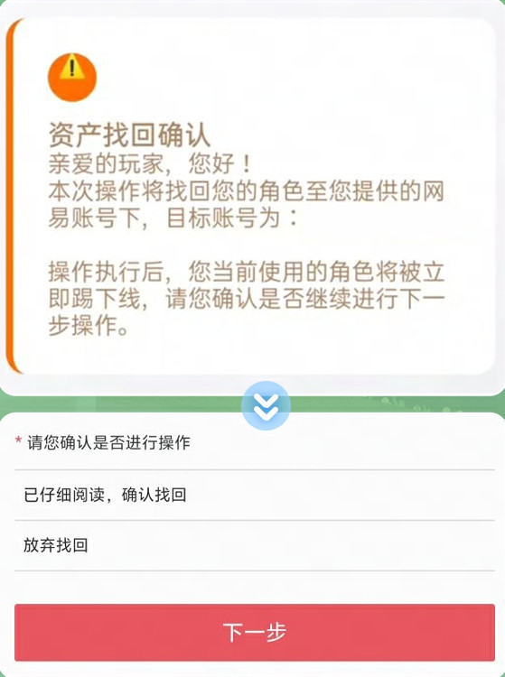 步骤八:确认资产找回的网易账号无误后,勾选【已仔细阅读,确认找回】,再点击【下一步】。