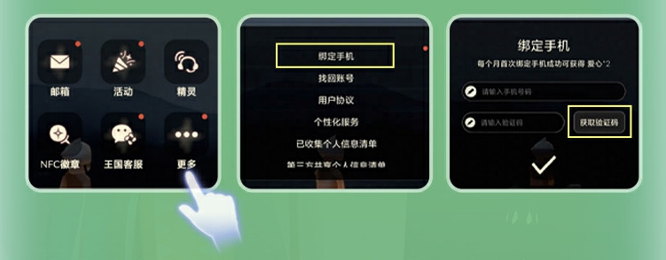 步骤三:跳转到找回指引H5页面,完成手机号绑定:点击游戏右上角【设置】-【更多】-【绑定手机】,完成游戏内手机号绑定。