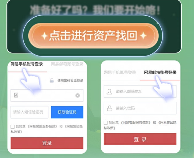 步骤五:完成上述步骤后,点击【进行资产找回】按钮,登录符合条件的网易账号。