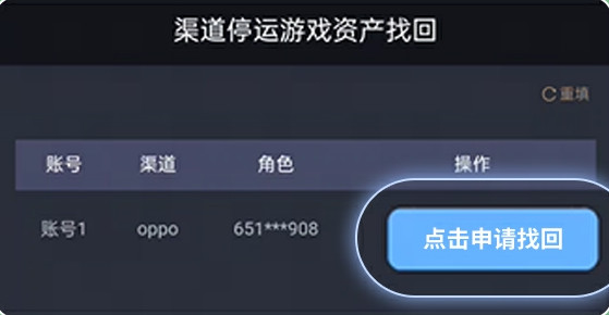 步骤七:查看填写的绑定手机号下是否存在待资产找回的OPPO渠道角色,确认后点击【点击申请找回】(若有多个角色/账号,可逐一找回)。