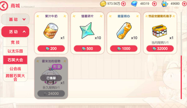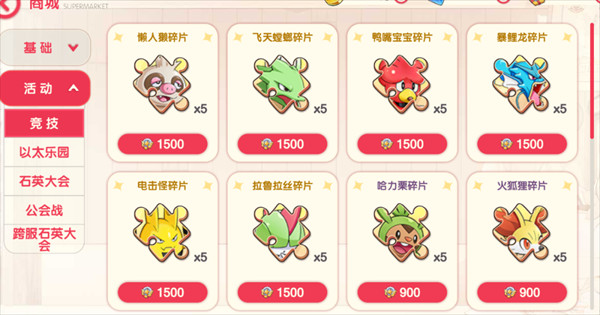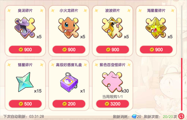 其他的材料,每周都要买一个紫色百变,主要是升级速度图鉴的精灵,上面有图自己对照下。这里的礼物跟彗星碎片也可以买,毕竟这个游戏的金币真的是太少了。