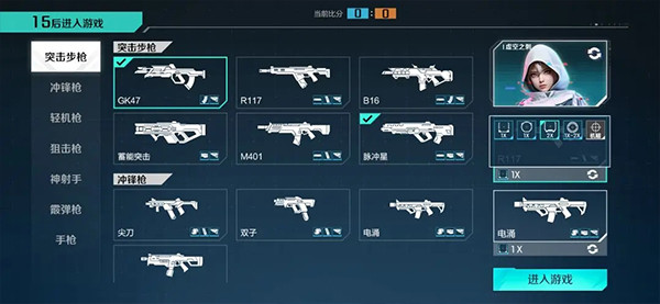 - 与经典模式不同的是,团队竞技模式没有备战岛,也没有飞行降落拾取武器装备的环节。在英雄选择完毕后,会直接进入枪械选择阶段;玩家可以在武器中选择两把心仪的武器,每把枪械都默认配满了蓝色配件,瞄准镜可以自行选择,另外,各位玩家在此阶段仍然可以更换英雄选择。