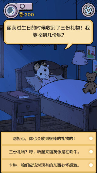 游戏中孩子上学第一天回来之后有些不开心,其他学生都不太喜欢他,会用奇怪的眼神看他。然后在玩家消耗了一个时间单位之后,孩子要求玩家跟他一起学习功课,并且会问玩家三个问题。虽然这三个问题怎么回答,对与错都不会有太多影响,但作为孩子的父母当然是希望能够正确地回答。