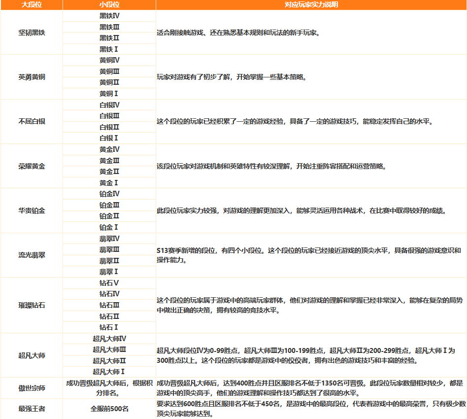 在的当前的最新赛季中,金铲铲之战的段位一共划分为了10个大的段位,每个大的段位下又分为了若干个小的段位、当玩家的段位积分满足一定的条件后即可晋升到更高的段位中,反之则会降低到更低的段位。下面是具体的段位等级划分。
