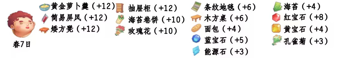 - 喜爱礼物:黄金萝卜羹、抽屉柜、简易屏风、海苔卷饼、矮方凳、玫瑰花;