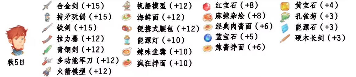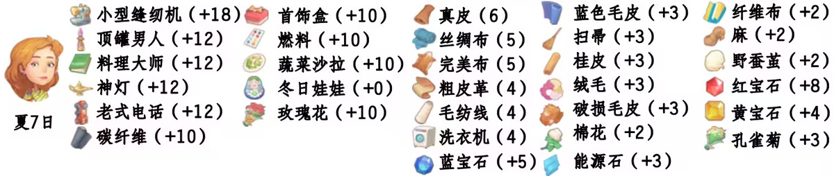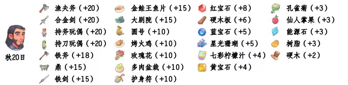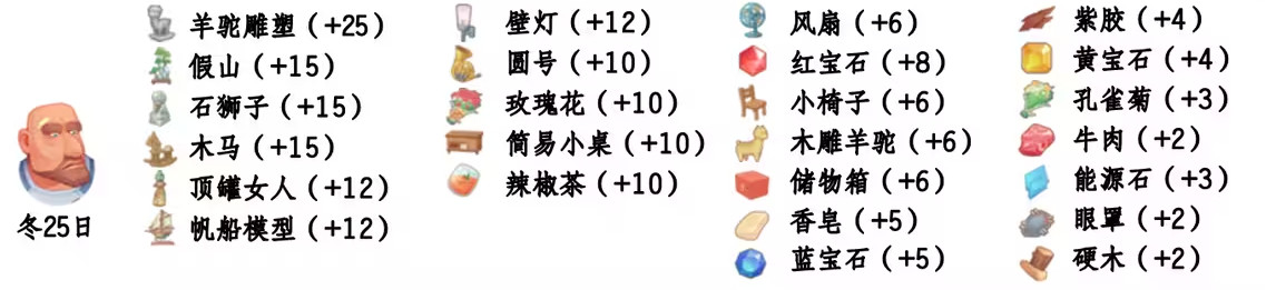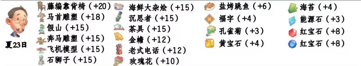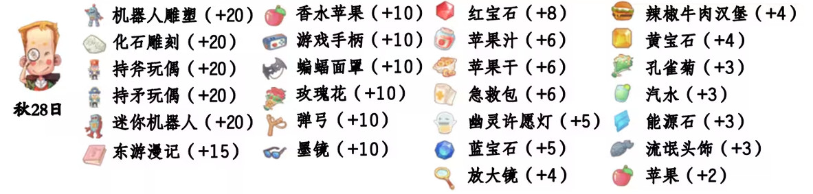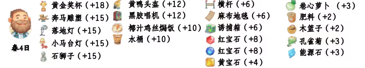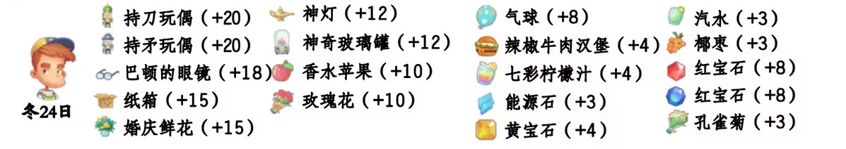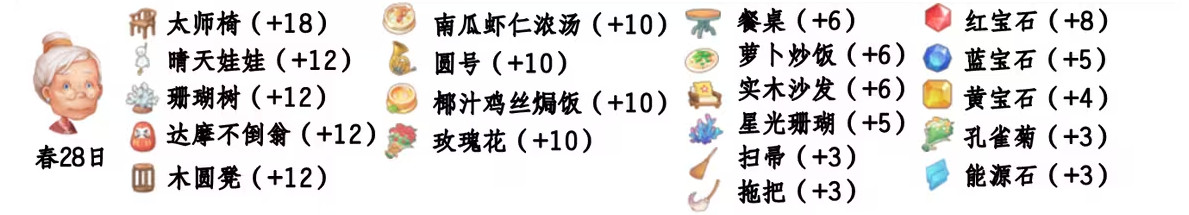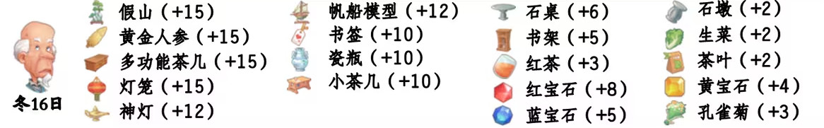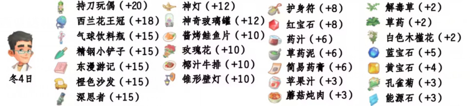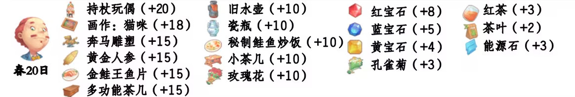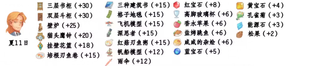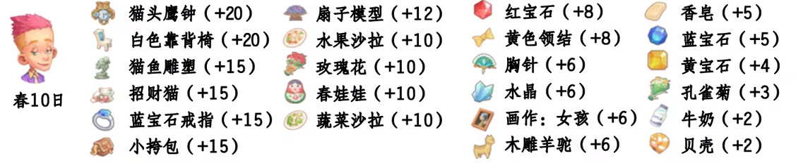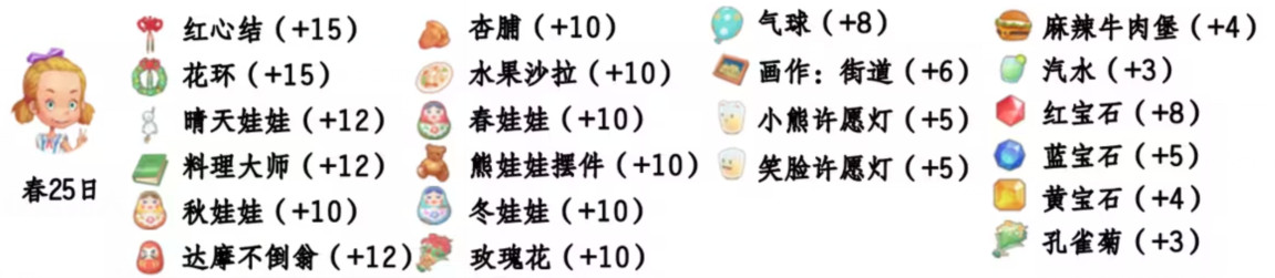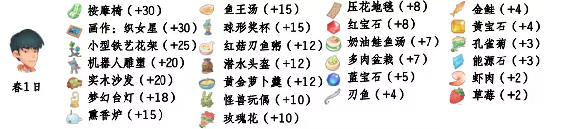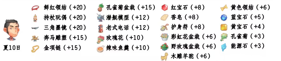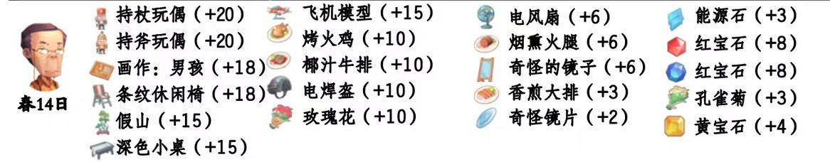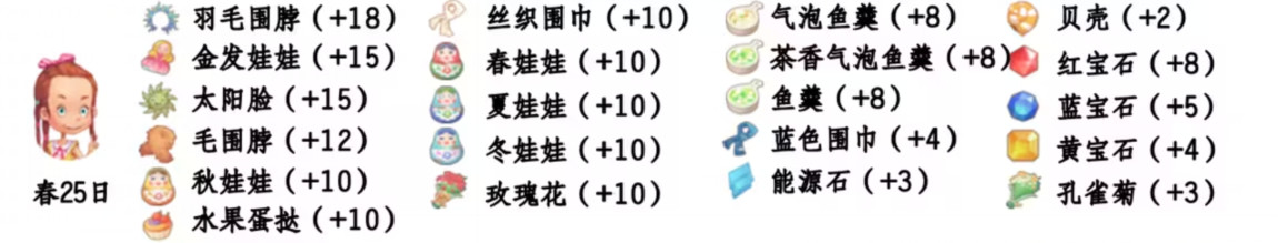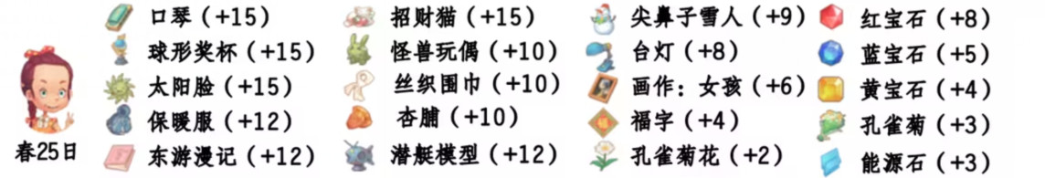 - 喜欢礼物:尖鼻子雪人、红宝石、台灯、蓝宝石、画作:女孩、黄宝石、福字、孔雀菊、孔雀菊花、能源石;