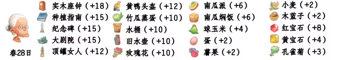 - 喜爱礼物:实木座钟、黄鸭头盔、种植指南、竹瓜蒸蛋、纪念碑、水桶、大剧院、旧水壶、顶罐女人;