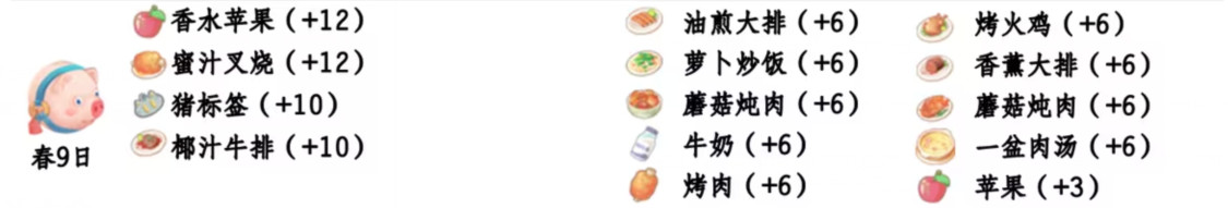 - 喜爱礼物:香水苹果、蜜汁叉烧、猪标签、椰汁牛排;