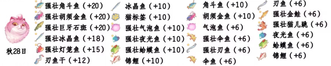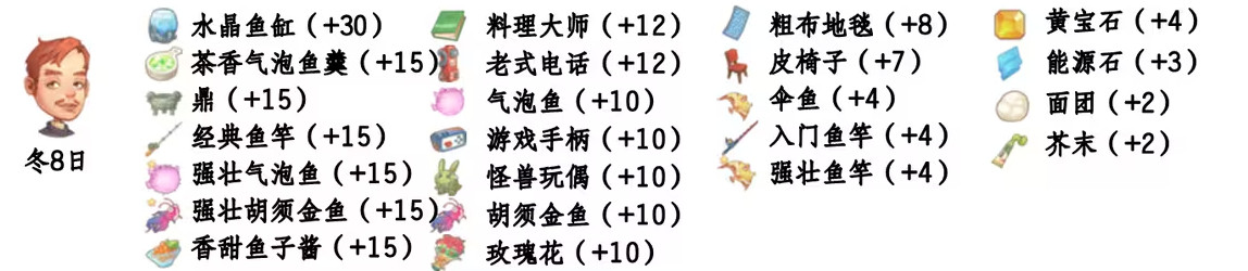 - 喜爱礼物:强壮角斗鱼、冰晶鱼、强壮胡须金鱼、猫标签、强壮巨牙石斑、强壮气泡鱼、强壮冰晶鱼、强壮夜光鱼、强壮灯笼鱼、强壮蛤蟆鱼、刃鱼干、锦鲤;
