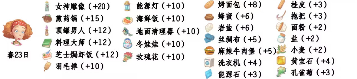 - 喜爱礼物:女神雕像、能源灯、煎药锅、海鲜饭、顶罐男人、地面清理器、料理大师、冬娃娃、芝士嘱虾饭、玫瑰花、羽毛捭;