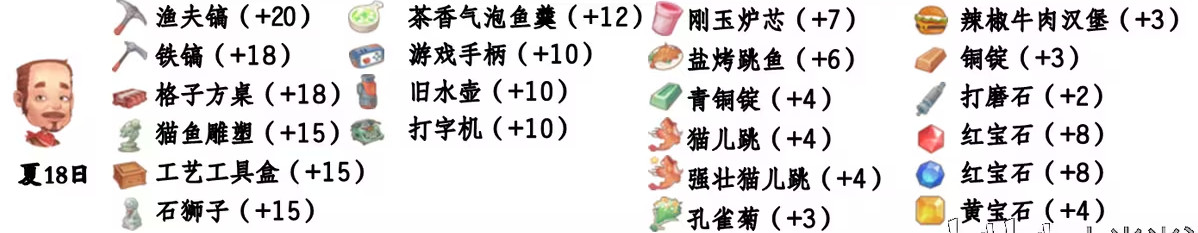 - 喜爱礼物:渔夫镐、茶香气泡鱼羹、铁镐、游戏手柄、格子方桌、旧水壶、猫鱼雕塑、打字机、工艺工具盒、石狮子;