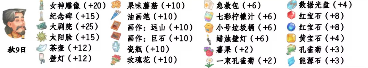 - 喜爱礼物:女神雕像、果味蘑菇、纪念碑、油画笔、大剧院、画作:远山、太阳脸、画作:巨石、茶壶、瓷瓶、壁灯、玫瑰花;