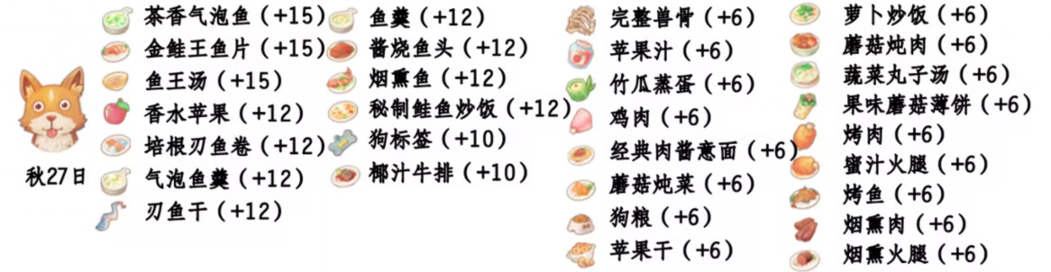 - 喜欢礼物:完整兽骨、萝卜炒饭、苹果汁、蘑菇炖肉、竹瓜蒸蛋、蔬菜丸子汤、果味蘑菇薄饼、鸡肉、烤肉、经典肉酱意面、蜜汁火腿、蘑菇炖菜、烤鱼、狗粮、烟熏肉、苹果干、烟焦火腿;