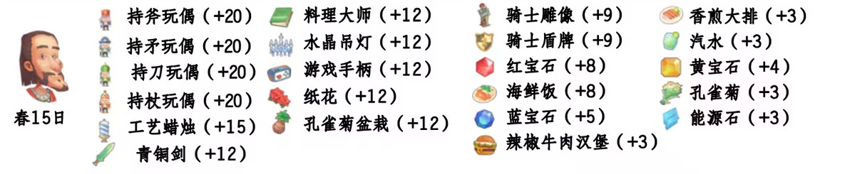 - 喜欢礼物:骑士雕像、香煎大排、骑士盾牌、汽水、红宝石、黄宝石、海鲜饭、孔雀菊、蓝宝石、能源石、辣椒牛肉汉堡;