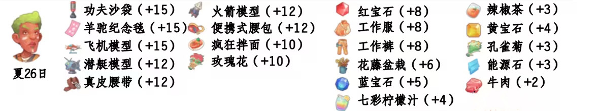 - 喜欢礼物:烤面包、桂皮、蜂蜜、拖把、岩盐、面粉、丝绸布、盐、麻辣牛肉堡、小麦、洗衣机、黄宝石、能源石、孔雀菊;