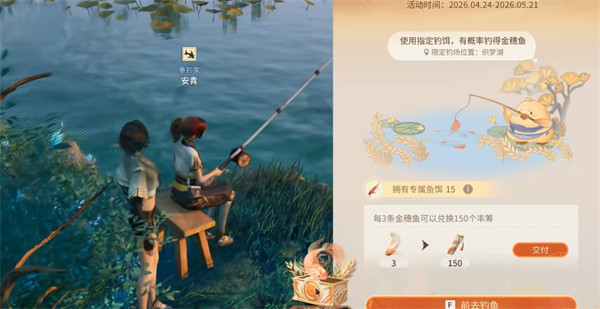 5、鱼跃金溪,是钓鱼玩法,找NPC对话,每天领20个活动鱼饵。在NPC面前的湖钓鱼,长按4或点血条左边随手道具选鱼竿,右边鱼饵切换成金穗鱼饵,普通鱼饵钓不出任务鱼。每3条金穗鱼换150丰筹。