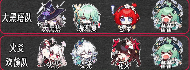 大黑塔队:大黑塔 + 那刻夏 + 缇宝 + 藿藿,藿藿回能助大黑塔和缇宝快速启动。