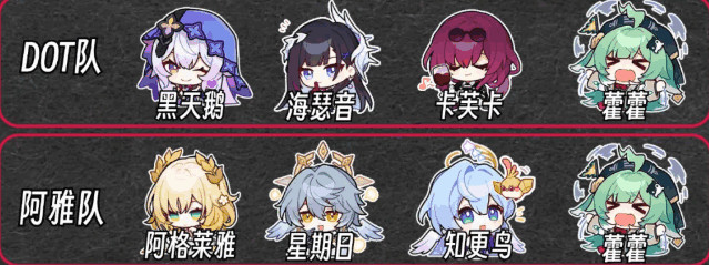 Dot队:黑天鹅 + 海瑟茵 + 卡芙卡 + 藿藿,藿藿解控避免卡芙卡被控制打断Dot,回能让黑天鹅和海瑟茵多放技能。