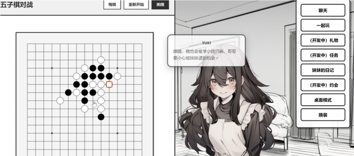 进入到五子棋对战的游戏里面以后,Yuki会先询问哥哥要先下吗?妹妹会慢慢陪你下,哥哥不要着急哦,之后,妹妹就会在棋盘上率先放上一子,在对弈的过程中,yuki还会根据玩家下棋时的速度以及动作给出不同的言语互动,比如说在下到第三个子的时候,yuki会根据玩家下棋的速度标识哥哥下棋好着急,妹妹的眼睛都要跟不上了,希望哥哥能够慢一点下棋,让妹妹能够看清楚一点,这个对话内容其实也意味着妹妹对哥哥提出的要求,玩家这时就需要调整自己下棋的速度,这样在下棋的时候,玩家也是能够收获妹妹的好感度的哦。