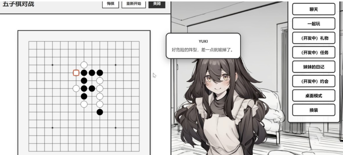 大家在和yuki玩五子棋这个小游戏的时候,也会注意到,该游戏其实和大家玩过的五子棋游戏的玩法是一样的,棋盘上提供了悔棋、重新开始以及关闭等三个选项,悔棋主要是在对弈的过程中,若是双方出现了下错子的情况,点击悔棋就能够重新去下子,重新开始则是对弈分出胜负以后,若是想要继续下棋的话,点击重新开始,就会进入到新一轮的对弈之中,关闭就很好理解了,不想下棋了直接点击关闭就会退出五子棋游戏哦,这三个不同的选项,不管选择哪一个选项都触发不一样的语言交互。