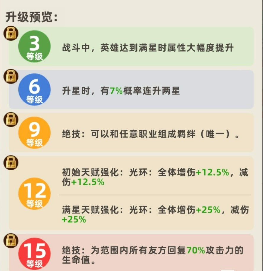 1、刘邦的基础天赋为初始光环,为全体友方单位提供10%增伤与减伤;升至三星后,该效果提升至20%增伤与20%减伤,是全队攻防两端的关键增幅来源。在实战定位中,他既是帝王羁绊的核心启动点,也是多套阵容通用的万能辅助组件,转型零成本,资源投入回报率极高。