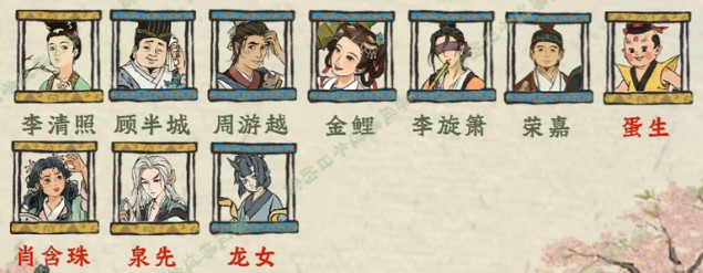 李清照、顾半城、周游越、金鲤、李旋箫、荣嘉、蛋生、肖含珠、泉先、龙女