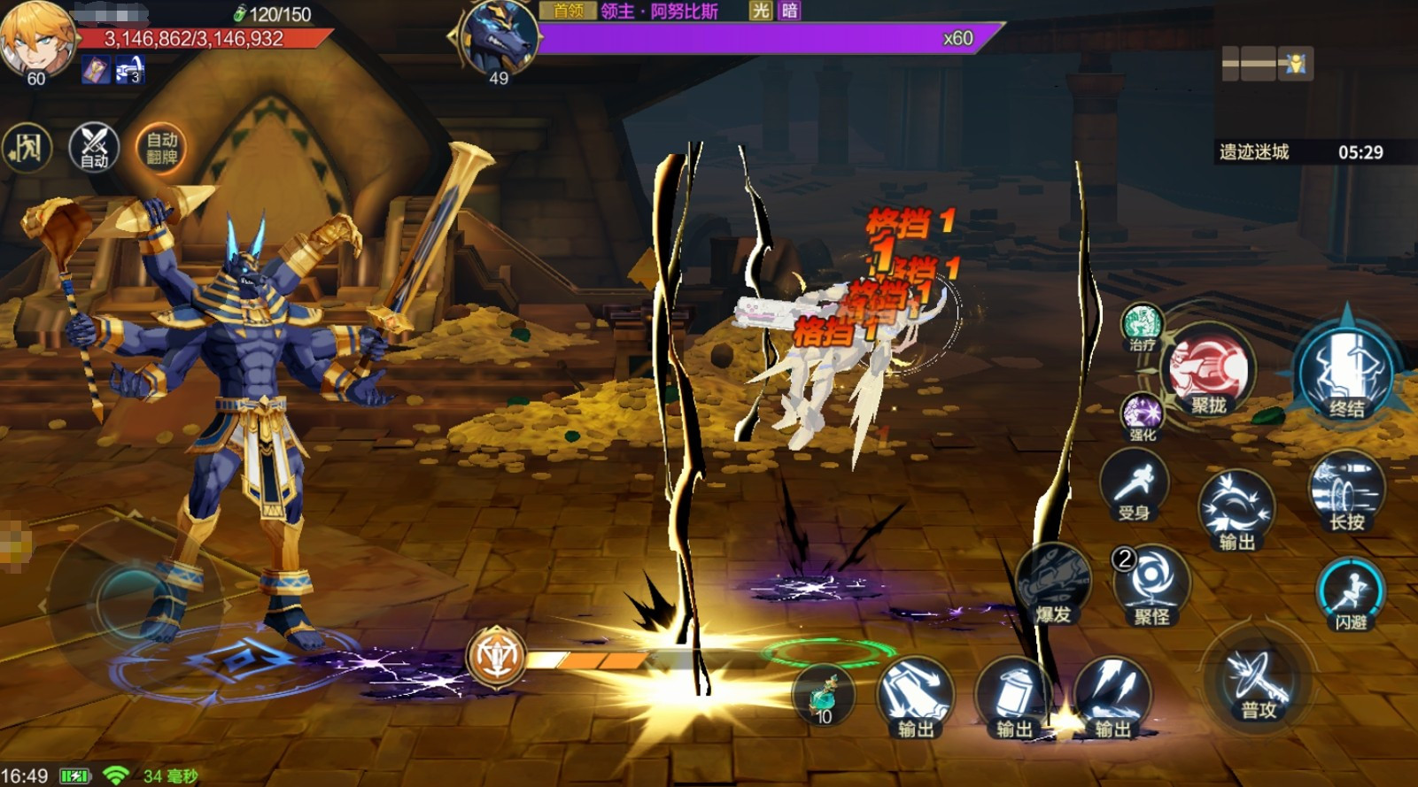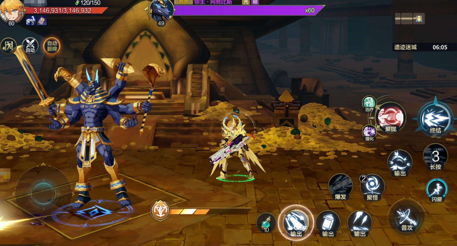 遗迹迷城普通4-12关卡是本章节的难点,玩家们将要直面该章节的最终boss阿努比斯。该boss的攻击招式覆盖范围广,且每次命中角色后,角色都会被控中,很容易就会被阿努比斯后续的技能命中,从而导致角色被一套秒掉。所以在挑战时玩家需多使用闪避功能,最好能避开它的一切攻击,宁愿将挑战时间拖得久一点或少打一些连招,也不要被技能命中。倘若玩家在挑战时觉得伤害略微有些不足,可在升到50级更换了新装备后再来挑战阿努比斯,通关概率会变得更高。