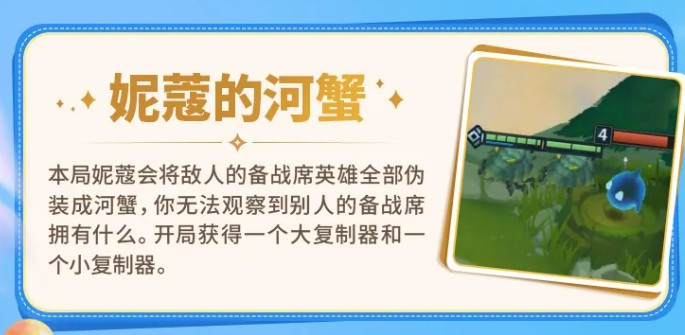 妮寇的河蟹就比较恶心了,会把所有对手的备战席英雄全部变成河蟹显示,看不出别人在攒什么阵容。开局送一个大复制器和一个小复制器,补偿还算厚道,但这局游戏基本没法参考别人的备战席来调整自己的节奏,只能靠自己排好阵容往下走。复制器的价值很高,拿到之后优先想好复什么,不要随便浪掉。