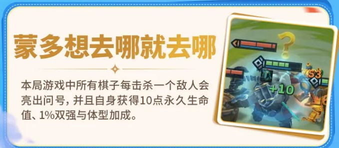 蒙多的效果是全局生效的,所有棋子每击杀一个敌人会亮问号,同时获得10点永久生命值、1%双强和体型加成。叠得越多、棋子越强。这种滚雪球型的机制在前期打得越顺后期越夸张,开局多注意保持胜场,复利效果还是很明显的。