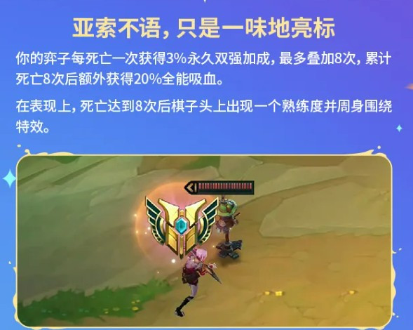 托儿索是一个死亡叠加型符文,每死一次获得3%永久双强加成,上限8次,叠满额外获得20%全能吸血,死亡8次后棋子头上还会出现特效。这个符文看起来是越死越强的路线,前期可以主动让棋子多消耗,把叠层尽量在中期补满,后期就会很暴力。