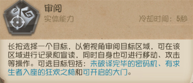 ①视野是有限的,且不能移动,多用于开局判断求生者的位置,开启一阶存在感技能“无效”后可用于记录破译求生者干扰破译及开门战封门。