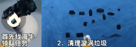 - 首先找海牛领取任务,然后就可以去清理漩涡垃圾了