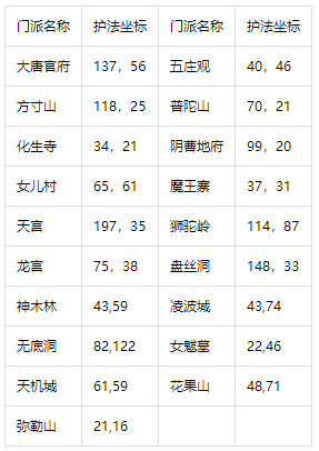 各门派护法的位置坐标: