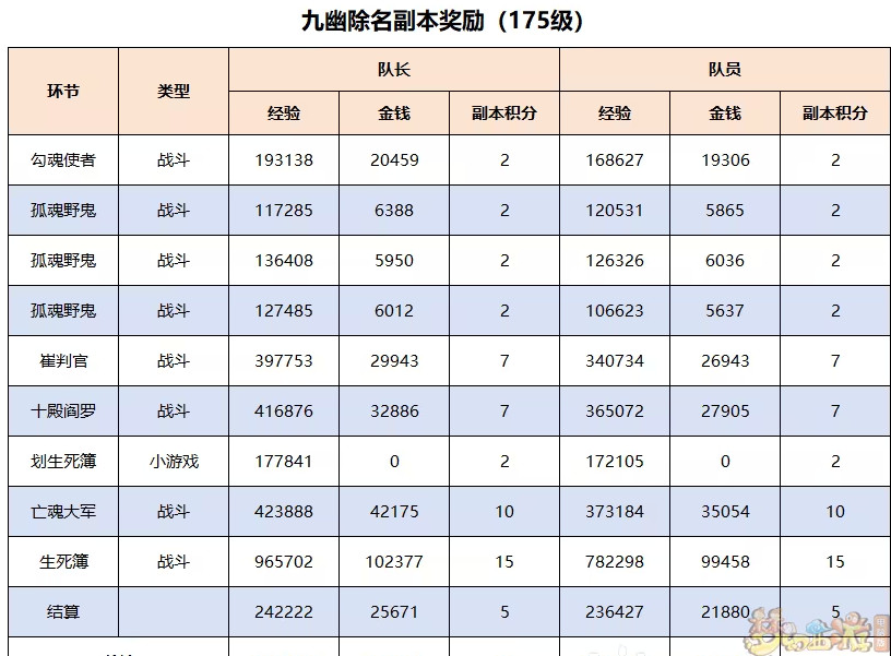 175级玩家完成九幽除名副本时经验及金钱奖励如下(现金模式):